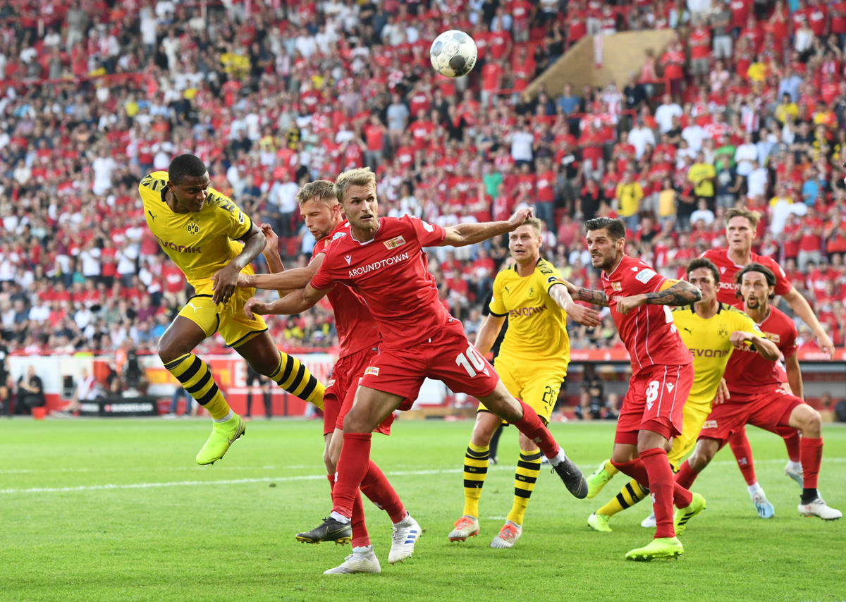 Soccer Football - Bundesliga - 1. FC Union Berlin v Borussia Dortmund - Stadion An der Alten Forsterei, Berlin, Germany - August 31, 2019 Borussia Dortmund's Manuel Akanji heads at goal REUTERS/Annegret Hilse