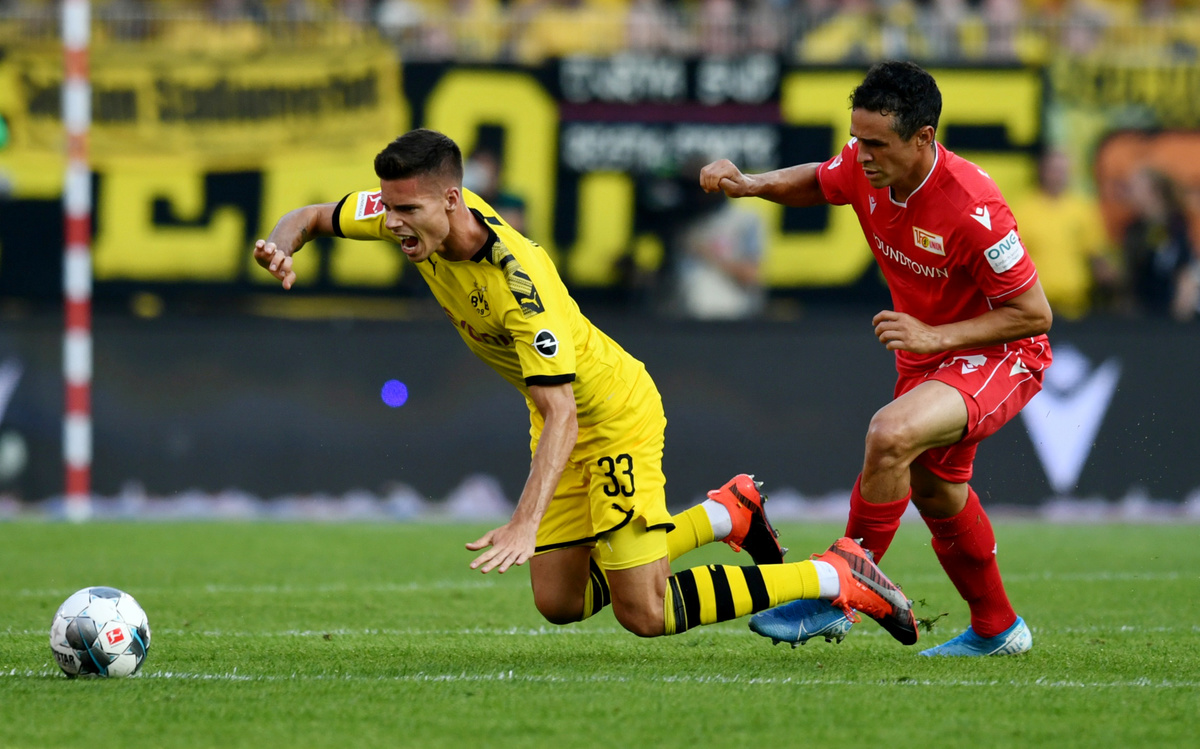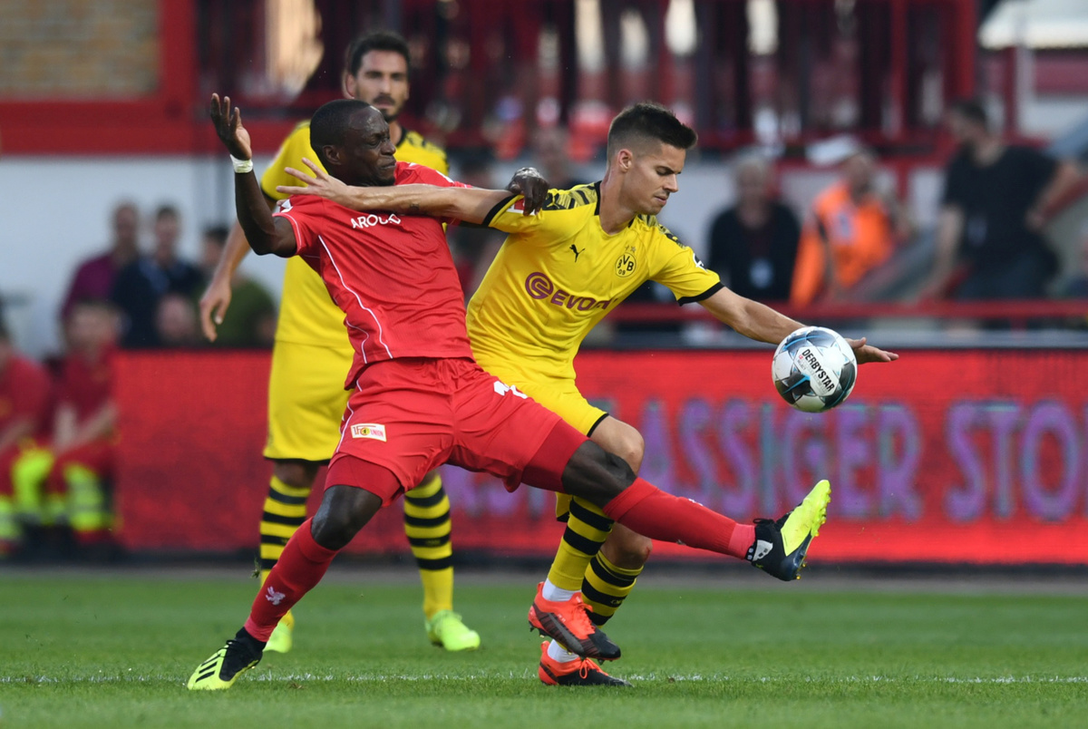Soccer Football - Bundesliga - 1. FC Union Berlin v Borussia Dortmund - Stadion An der Alten Forsterei, Berlin, Germany - August 31, 2019 Borussia Dortmund's Julian Weigl in action with 1. FC Union Berlin's Manuel Schmiedebach REUTERS/Annegret Hilse