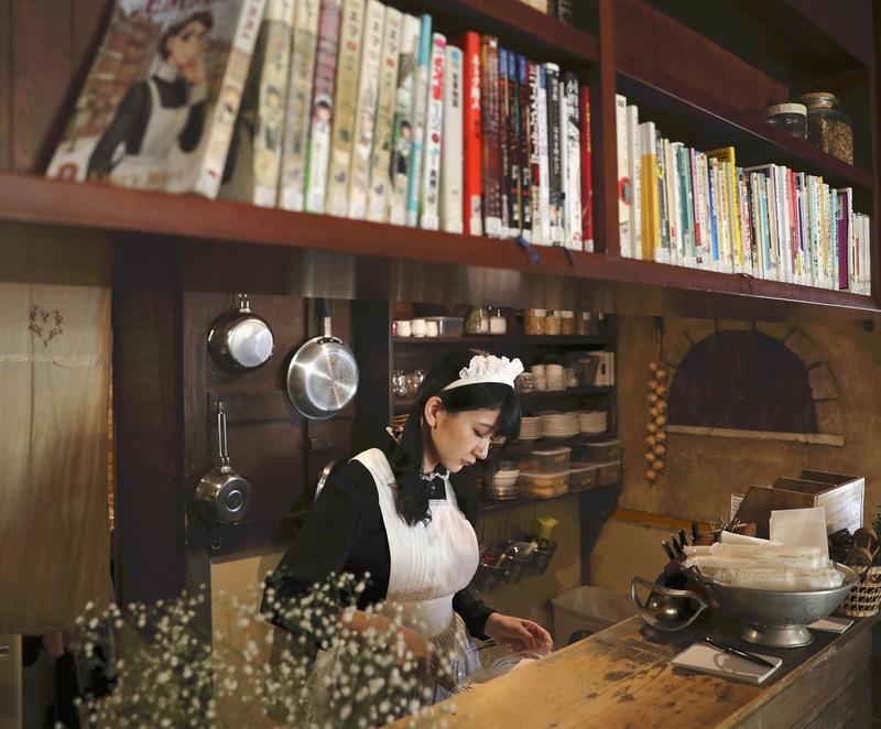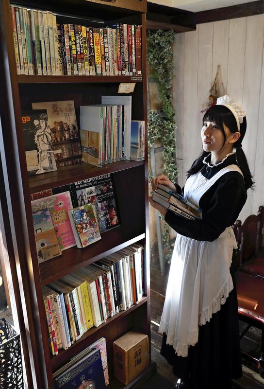In the Schatzkiste private library and cafe in Chiyoda Ward, Tokyo, customers are welcomed by waitresses in traditional maid costumes with long skirts. Many of the books were donated by the waitresses and reflect their interests.