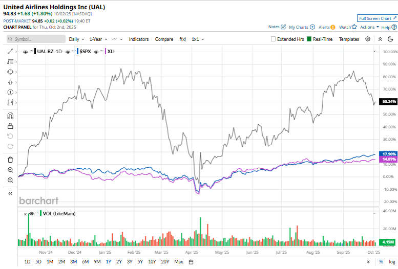 UAL stock has surged 70.1% over the past year, outperforming the S&P 500 Index’s ($SPX) 12.6% gains and the Industrial Select Sector SPDR Fund’s (XLI) 20.5% gains over the same time frame.
