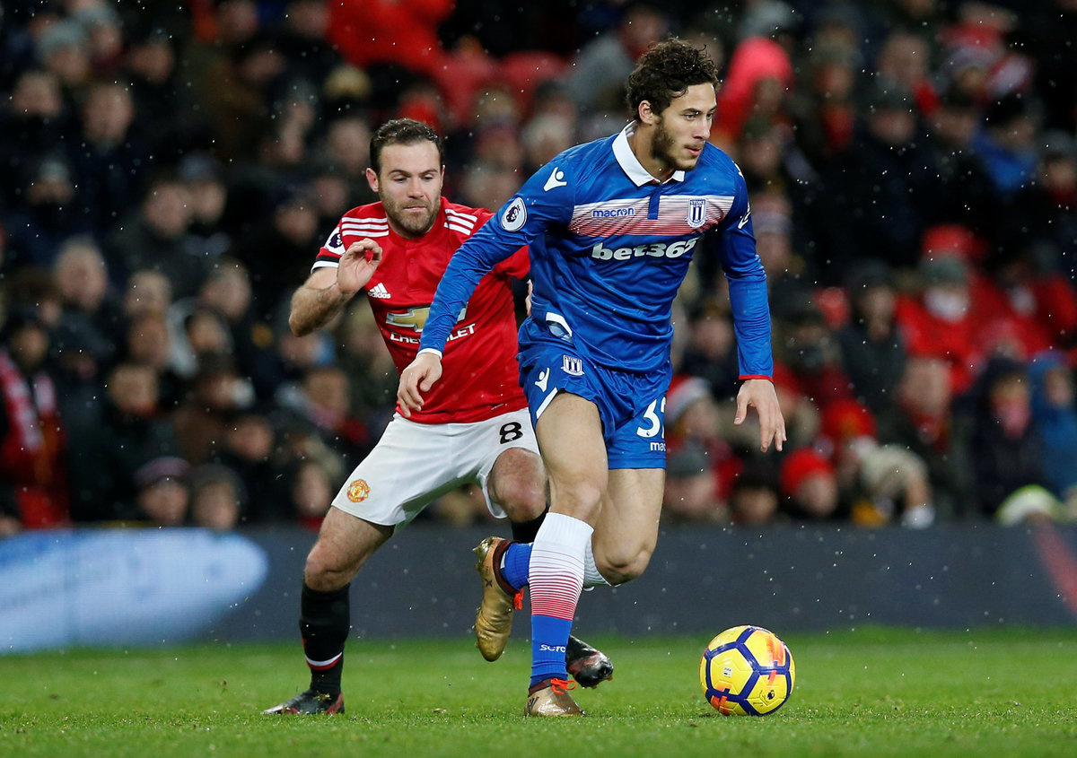 Soccer Football - Premier League - Manchester United vs Stoke City - Old Trafford, Manchester, Britain - January 15, 2018 Stoke City's Ramadan Sobhi in action with Manchester United's Juan Mata REUTERS/Andrew Yates