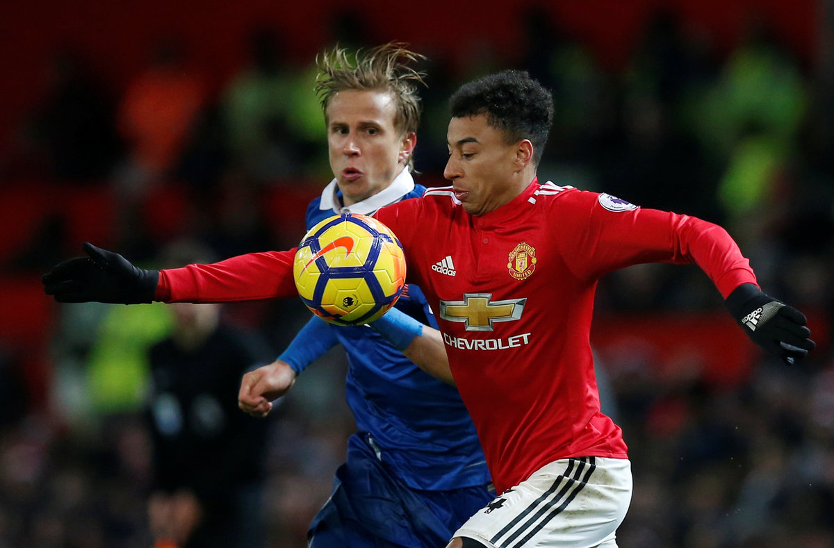 Soccer Football - Premier League - Manchester United vs Stoke City - Old Trafford, Manchester, Britain - January 15, 2018 Manchester United's Jesse Lingard in action with Stoke City’s Moritz Bauer REUTERS/Andrew Yates