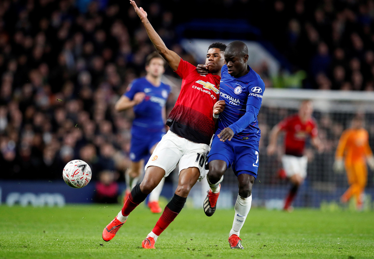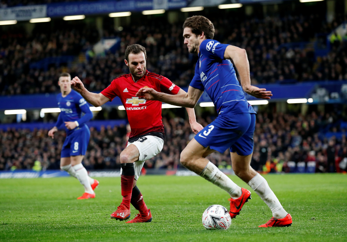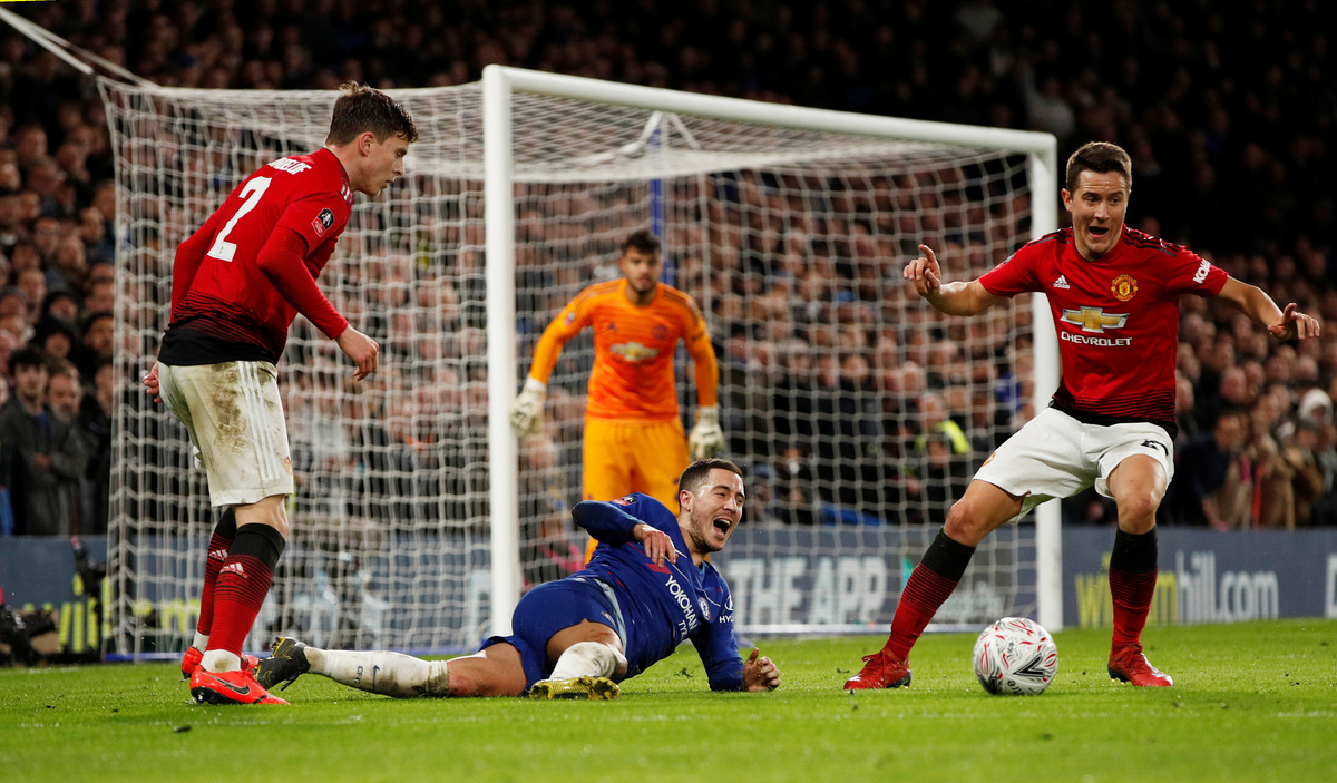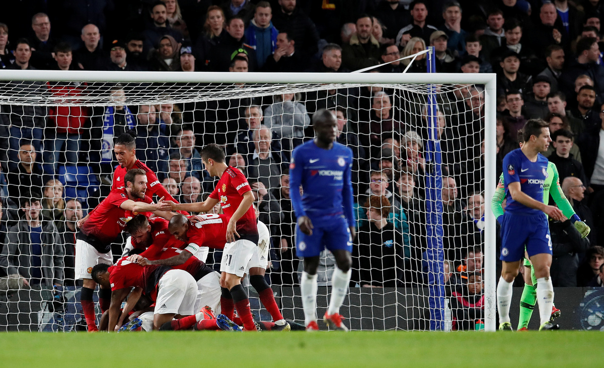 LONDON (Reuters) - Manchester United's Ander Herrera and Paul Pogba headed first-half goals to claim a 2-0 win that dumped FA Cup holders Chelsea out of the competition and secured a place in the quarter-finals in an intense tie at Stamford Bridge on Monday.