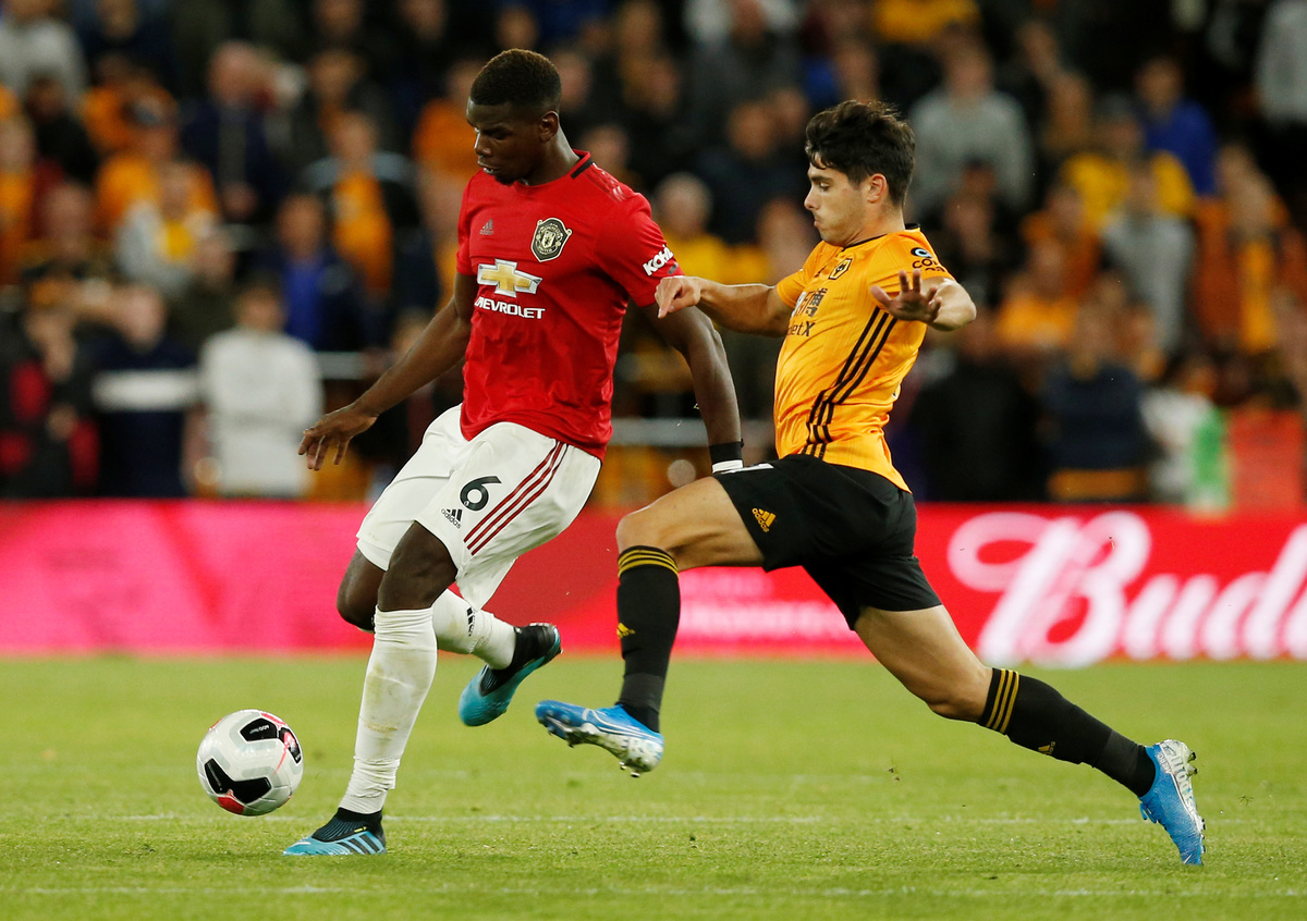 Soccer Football - Premier League - Wolverhampton Wanderers v Manchester United - Molineux Stadium, Wolverhampton, Britain - August 19, 2019 Manchester United's Paul Pogba in action with Wolverhampton Wanderers' Pedro Neto REUTERS/Andrew Yates