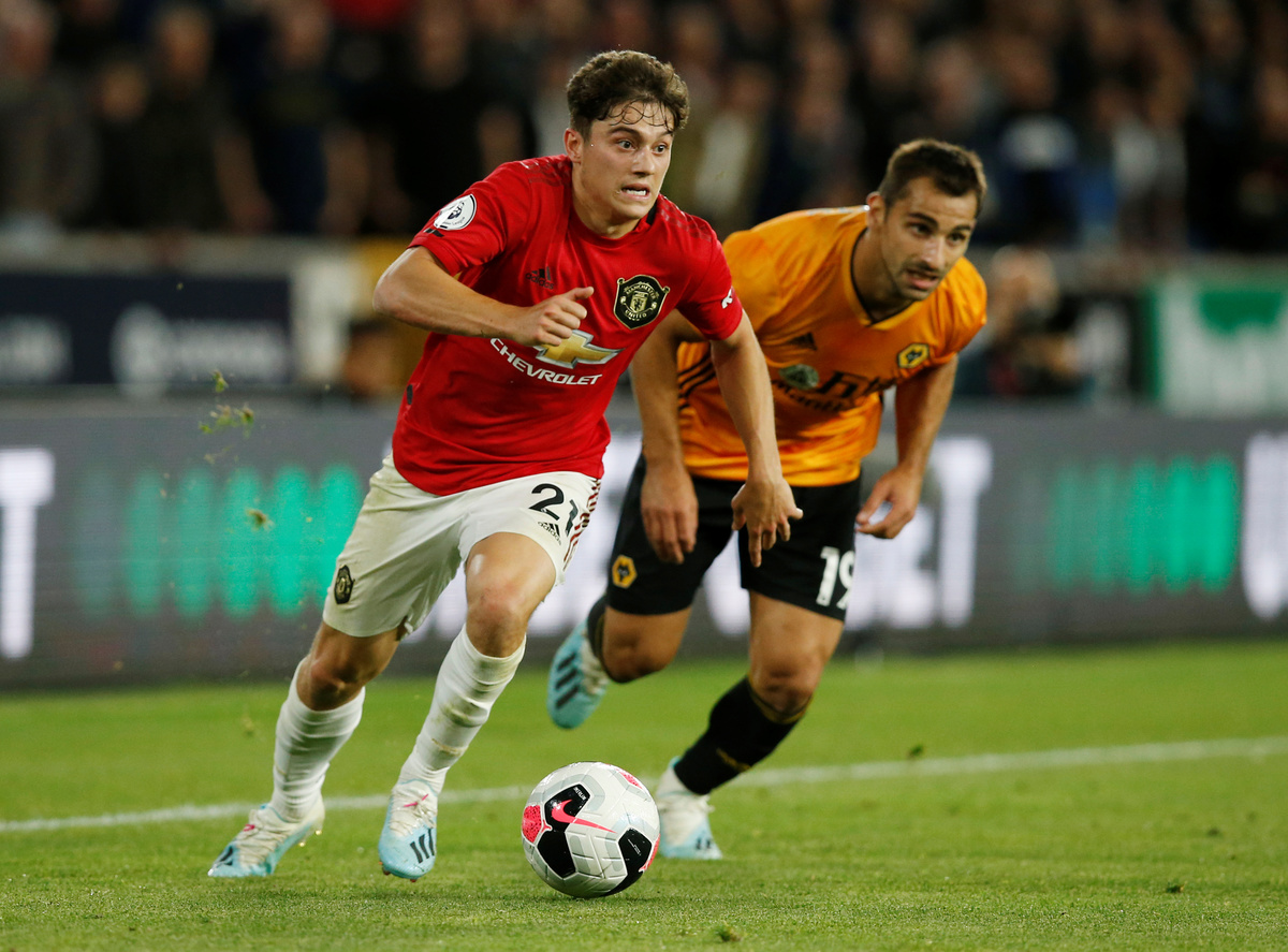 Soccer Football - Premier League - Wolverhampton Wanderers v Manchester United - Molineux Stadium, Wolverhampton, Britain - August 19, 2019 Manchester United's Daniel James in action with Wolverhampton Wanderers' Jonny REUTERS/Andrew Yates