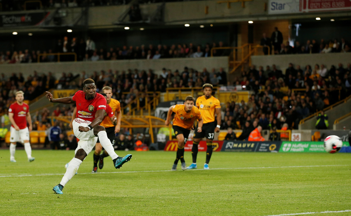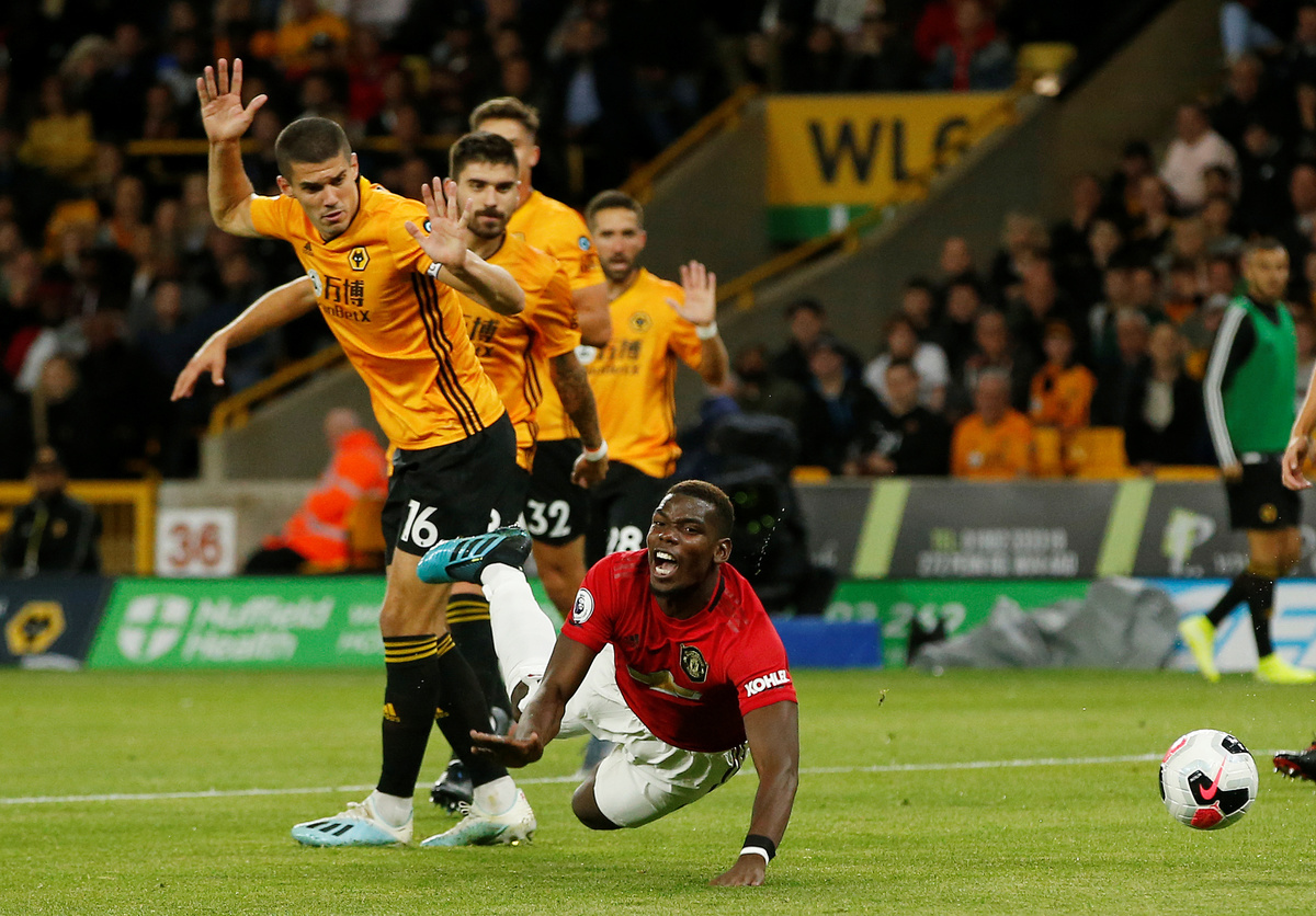 Soccer Football - Premier League - Wolverhampton Wanderers v Manchester United - Molineux Stadium, Wolverhampton, Britain - August 19, 2019 Manchester United are awarded a penalty after Paul Pogba is brought down by Wolverhampton Wanderers' Conor Coady REUTERS/Andrew Yates