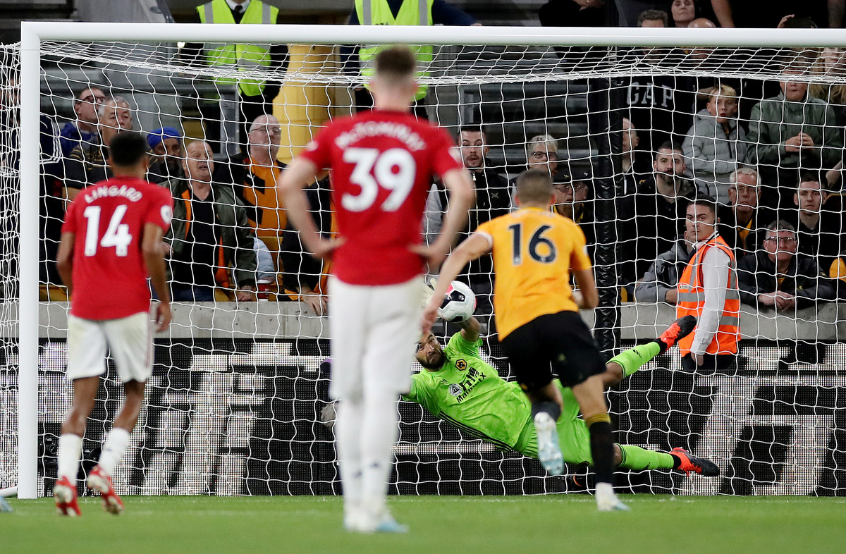 Soccer Football - Premier League - Wolverhampton Wanderers v Manchester United - Molineux Stadium, Wolverhampton, Britain - August 19, 2019 Wolverhampton Wanderers' Rui Patricio saves a penalty taken by Manchester United's Paul Pogba (not pictured) Action Images via Reuters/Carl Recine
