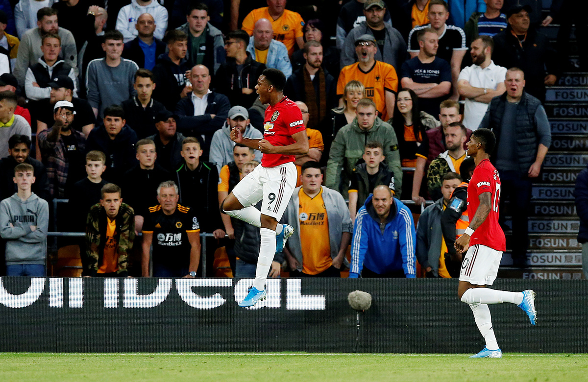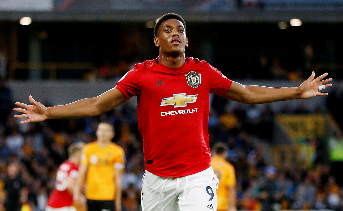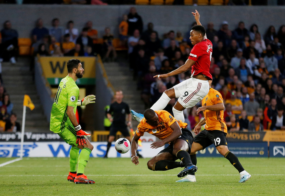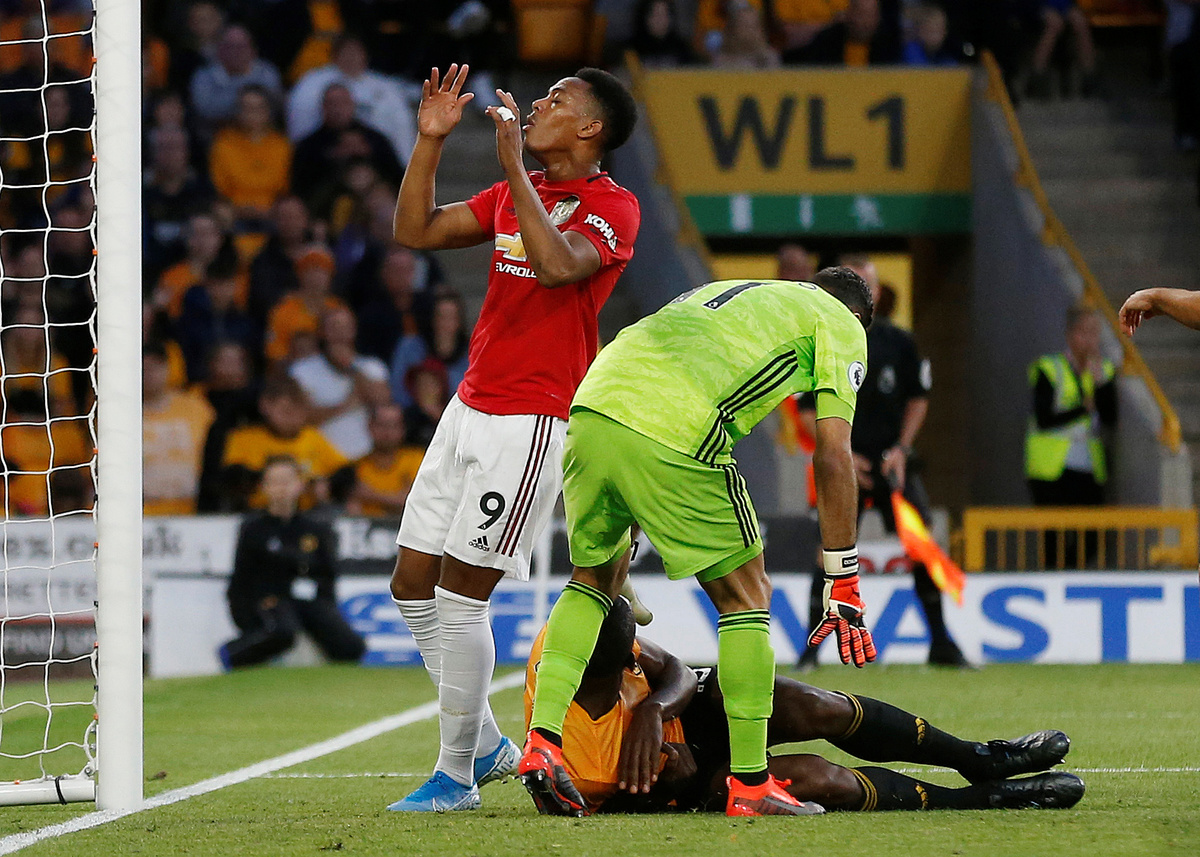 Soccer Football - Premier League - Wolverhampton Wanderers v Manchester United - Molineux Stadium, Wolverhampton, Britain - August 19, 2019 Manchester United's Anthony Martial attempts to convert a cross Action Images via Reuters/Carl Recine Soccer Football - Premier League - Wolverhampton Wanderers v Manchester United - Molineux Stadium, Wolverhampton, Britain - August 19, 2019 Manchester United's Anthony Martial reacts after a missed chance Action Images via Reuters/Carl Recine Soccer Football - Premier League - Wolverhampton Wanderers v Manchester United - Molineux Stadium, Wolverhampton, Britain - August 19, 2019 Manchester United's Harry Maguire in action Action Images via Reuters/Carl Recine Soccer Football - Premier League - Wolverhampton Wanderers v Manchester United - Molineux Stadium, Wolverhampton, Britain - August 19, 2019 Manchester United's Anthony Martial (not pictured) scores their first goal as Wolverhampton Wanderers' Rui Patricio reacts REUTERS/Andrew Yates Soccer Football - Premier League - Wolverhampton Wanderers v Manchester United - Molineux Stadium, Wolverhampton, Britain - August 19, 2019 Manchester United's Anthony Martial celebrates scoring their first goal REUTERS/Andrew Yates Soccer Football - Premier League - Wolverhampton Wanderers v Manchester United - Molineux Stadium, Wolverhampton, Britain - August 19, 2019 Manchester United's Anthony Martial celebrates scoring their first goal Action Images via Reuters/Carl Recine Soccer Football - Premier League - Wolverhampton Wanderers v Manchester United - Molineux Stadium, Wolverhampton, Britain - August 19, 2019 Manchester United's Paul Pogba has his penalty saved by Wolverhampton Wanderers' Rui Patricio (not pictured) REUTERS/Andrew Yates .Soccer Football - Premier League - Wolverhampton Wanderers v Manchester United - Molineux Stadium, Wolverhampton, Britain - August 19, 2019 Manchester United's Daniel James in action with Wolverhampton Wanderers' Jonny REUTERS/Andrew Yates