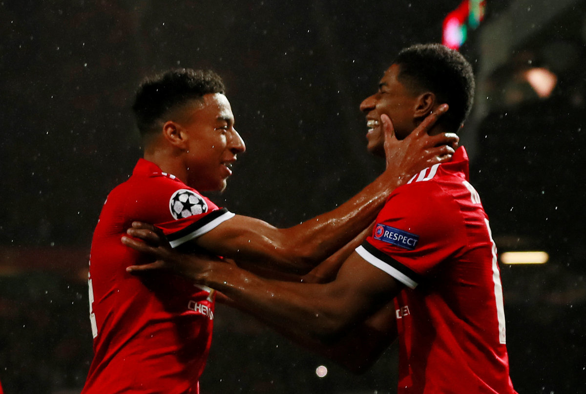 Soccer Football - Champions League - Manchester United vs FC Basel - Old Trafford, Manchester, Britain - September 12, 2017 Manchester United's Marcus Rashford celebrates scoring their third goal with Jesse Lingard Action Images via Reuters/Jason Cairnduff