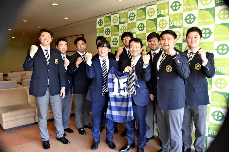 KYOTANABE, Kyoto -- Eight members of Doshisha University's rugby club in Kyotanabe, Kyoto Prefecture, have left for India to participate in volunteer activities for the Japan International Cooperation Agency. Before leaving Japan, they paid a courtesy call to Mayor Takashi Kamimura at Kyotanabe City Hall in early February to express their enthusiasm. The students aim to increase the popularity of rugby and through various activities encourage the healthy development of the youth in India.