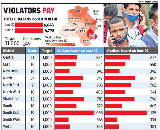 NEW DELHI: With the reopening of markets, cases of Covid norm violations are growing and it is not uncommon to find people without masks in public places. About 6,000-7,000 challans are being issued every day by teams of district enforcement officials deployed across the capital. After reports of violations were received from various markets, the authorities concerned have deployed more teams in markets and crowded places.