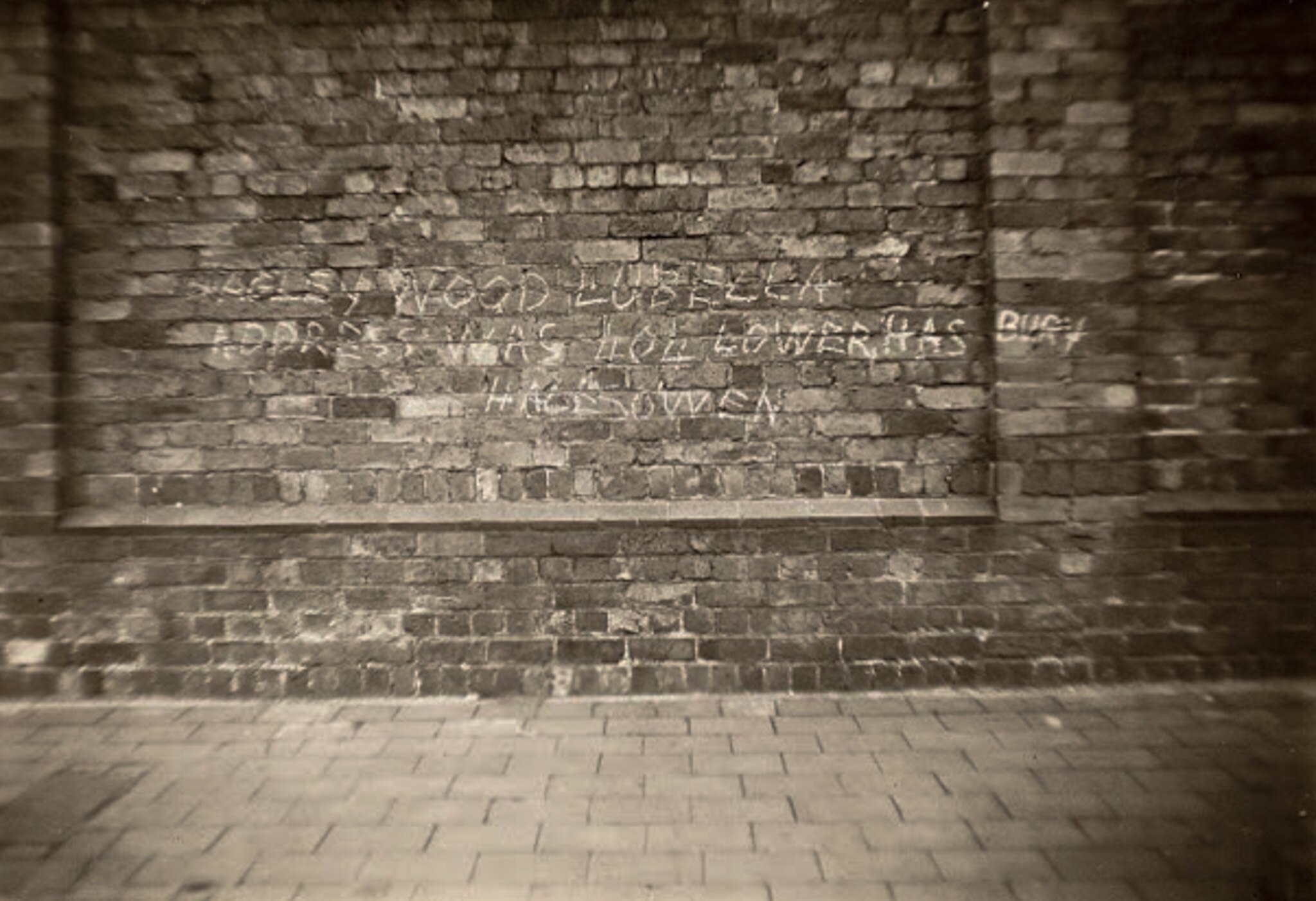 According to the Evening Dispatch on March 30, 1944: "The writing was too high on the wall to have been done by boys, and the police are inclined to the view that it is the work of someone coming into the city early in the morning with farm produce."