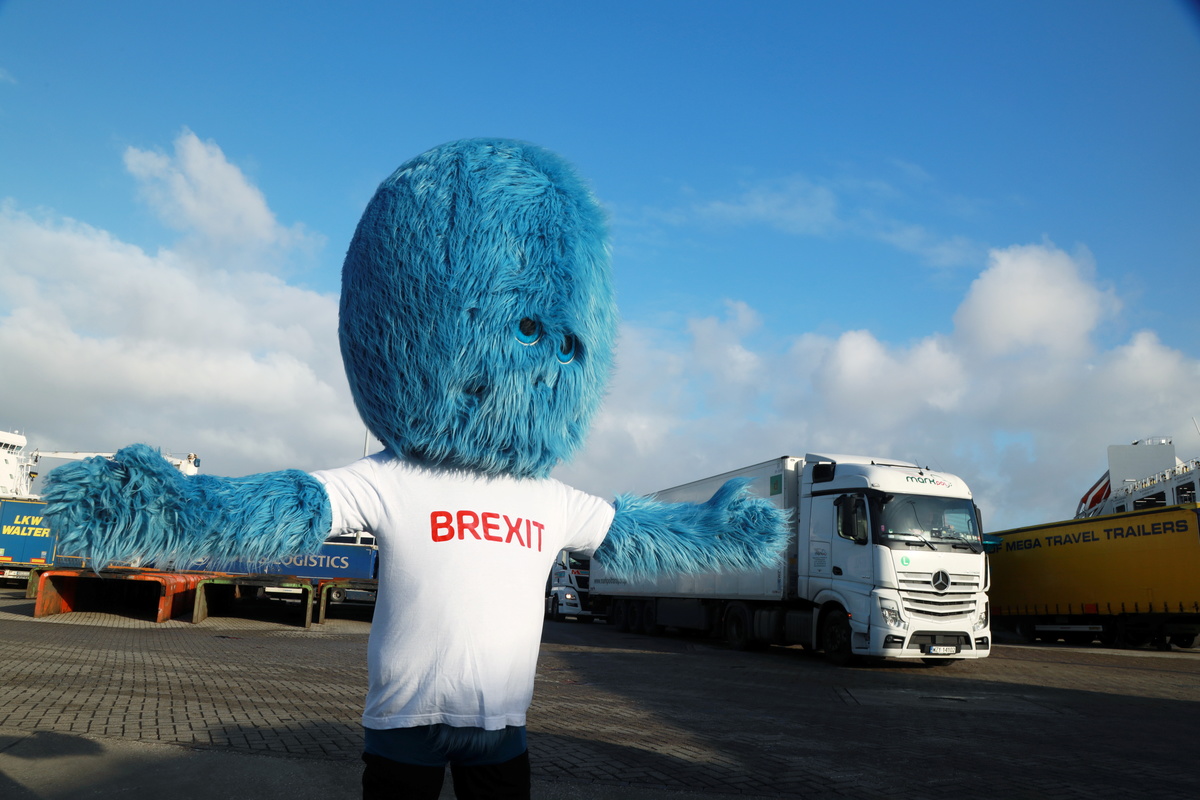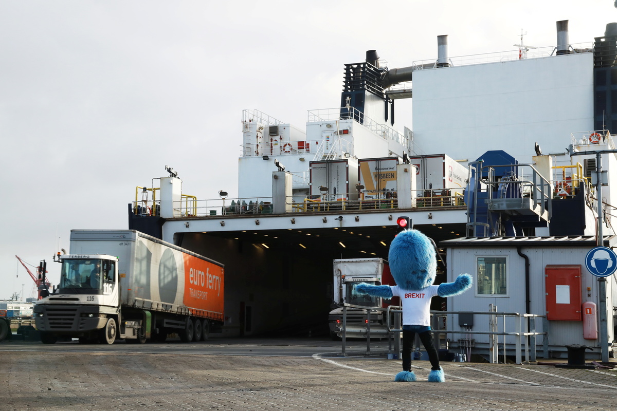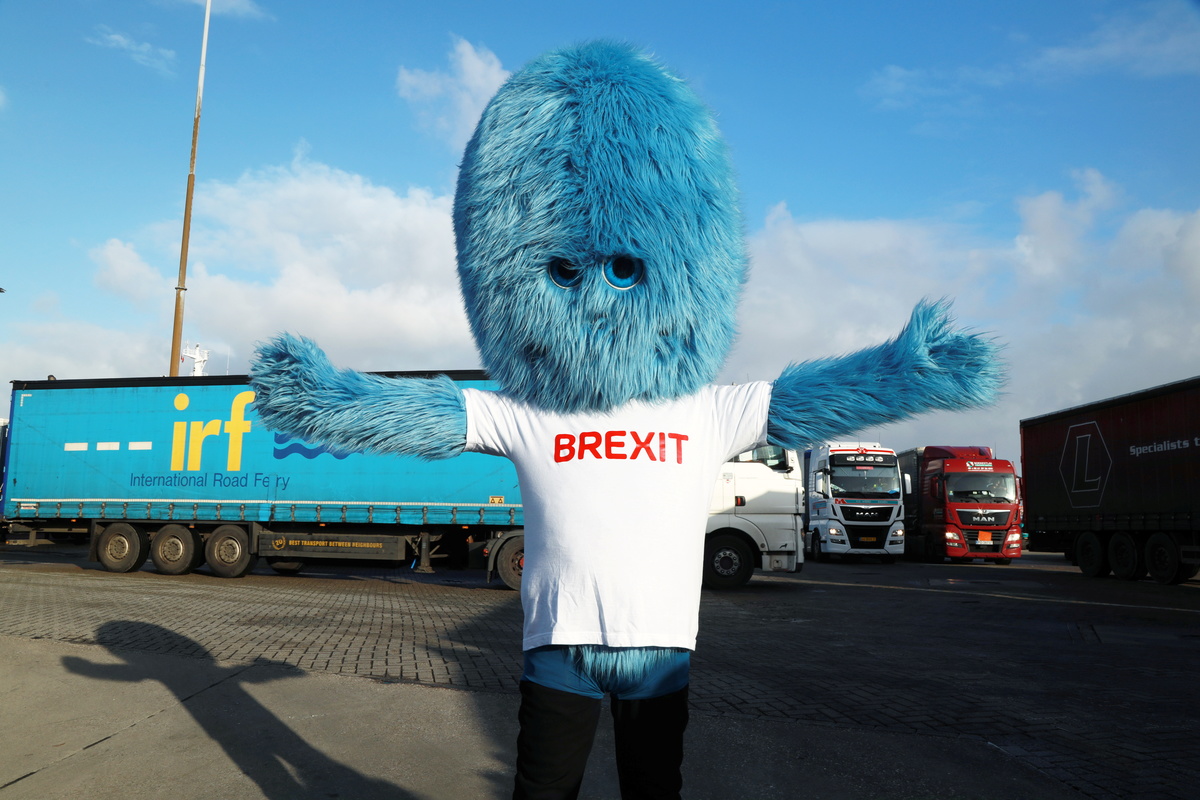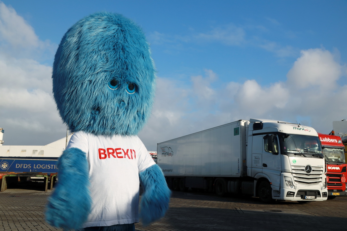The "Brexit Monster", a furry blue mascot created by the Netherlands to personify problems linked to Britain's EU departure, made an appearance at the Port of Rotterdam on Tuesday to warn that customs controls are coming on Jan. 1.