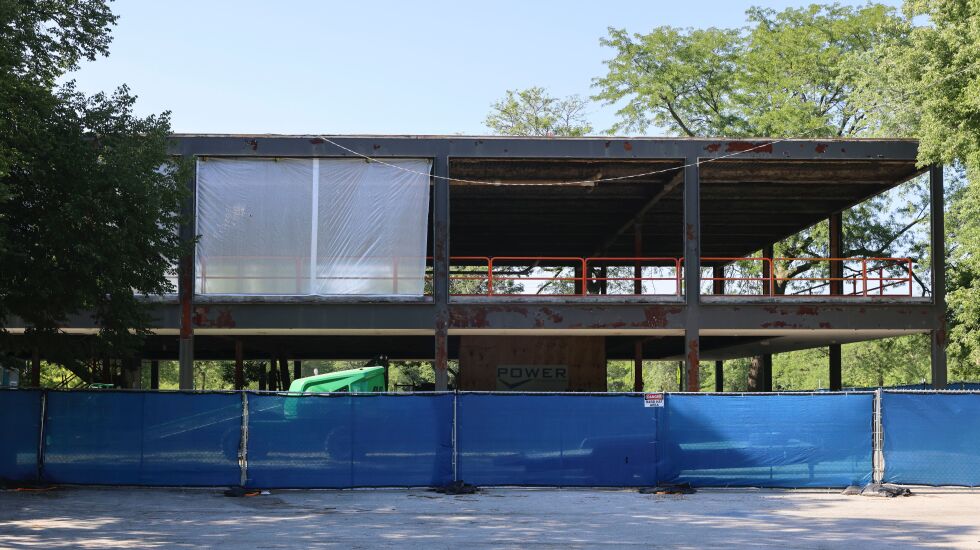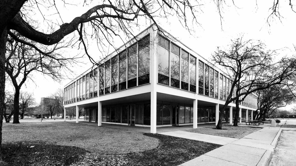 The work also allows Draper & Kramer to correct the blunder it made a few years back when it changed the building’s color from white — the same shade used at Mies van der Rohe’s famed Farnsworth House in Plano — to a drab, dark gray.