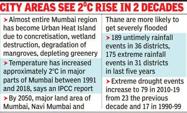 According to the report, almost the entire Mumbai region has become an Urban Heat Island (UHI) as a result of increased concretization, destruction of wetlands, degradation of mangroves and depleting greenery along with areas such as Kothrud, Hadapsar, Aundh and Viman Nagar in Pune city. UHIs have higher daytime temperatures which contribute to flash floods and unseasonal showers besides causing reduction in groundwater levels. "While major parts of Mumbai have experienced a temperature rise of approximately 2 degree C between 1991-2018, the parts of Pune have experienced about 3 degree C temperature rise between 2001-2016," the report points out.