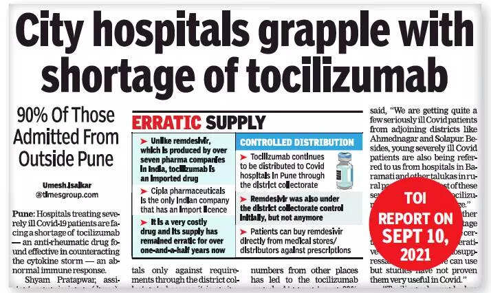 PUNE: The administration has started diverting unused stock of tocilizumab — an anti-rheumatic drug administered to severely ill Covid-19 patients — from Satara to Pune to address its acute shortage in the district.