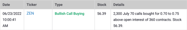 At the time, (ZEN) was trading at $56.39. Today, the stock is surging, trading as high as $93.57 in the premarket, a share-price appreciation of more than 61%. The stock opened at $75.35, and those $70-strike July calls jumped in price by 700% — trading as high as $5.80 per contract. Not bad for an average trade price of $0.725. That means this trader had the opportunity to make nearly a million dollars overnight on this suspiciously well-timed trade.