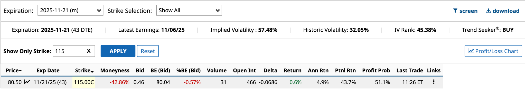 To complete the covered strangle, you would sell one call for premium income. For illustration purposes, I’ll select the Nov. 21 call furthest OTM. That would be $115.