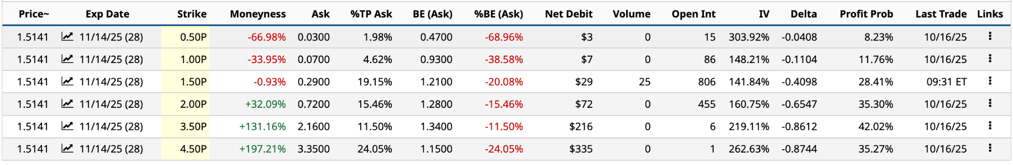 Of the potential puts (less than $3) expiring on Nov. 14, there are four under $3. However, to execute the long strangle, you need some volume, so I’ll go with the $1.50 put and the $0.29 ask price.