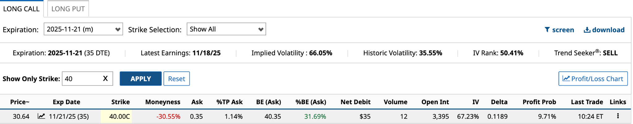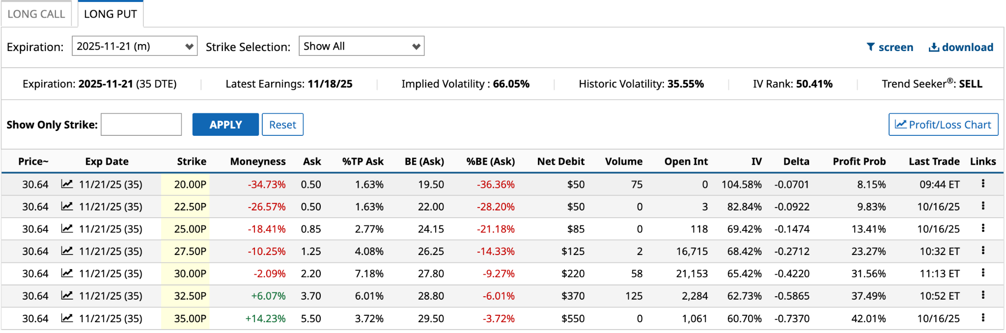 I’m looking for a put expiring on Nov. 21, with a strike price lower than $40.