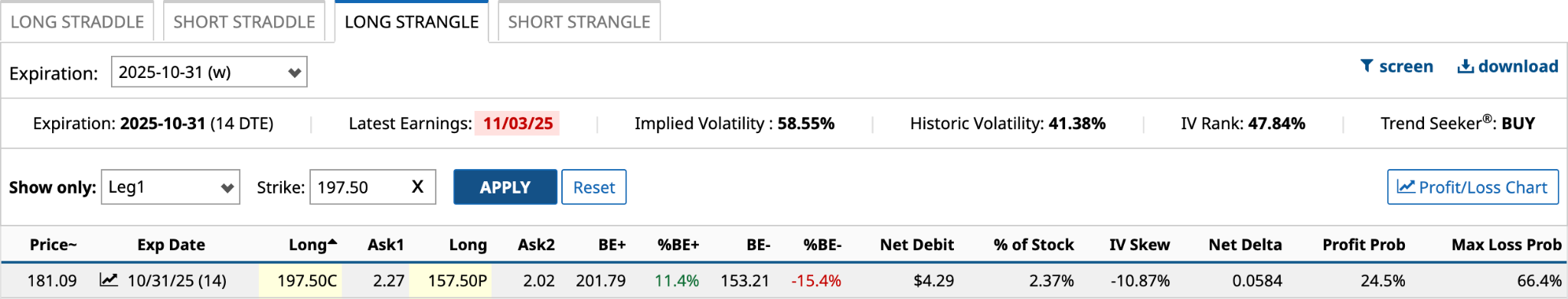 In yesterday’s unusual options activity, it had plenty of calls and puts with Vol/OI ratios over 1.0. Of all of them, a call and put with an Oct. 31 expiry stand out--and they just happen to set up for a long strangle.