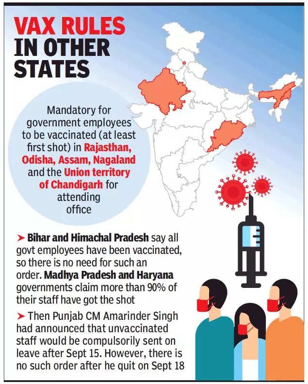 NEW DELHI: No unvaccinated Delhi government employee will be allowed to attend office from October 16. In an order issued on Friday, the government said at least one dose of Covid vaccination is mandatory to attend office. All those who have not received even one dose will be marked absent.