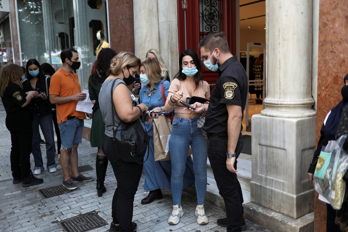 Those vaccinated against COVID-19 also have to present their vaccination certificates, triggering long lines outside shops in the capital's busiest shopping street, Ermou.
