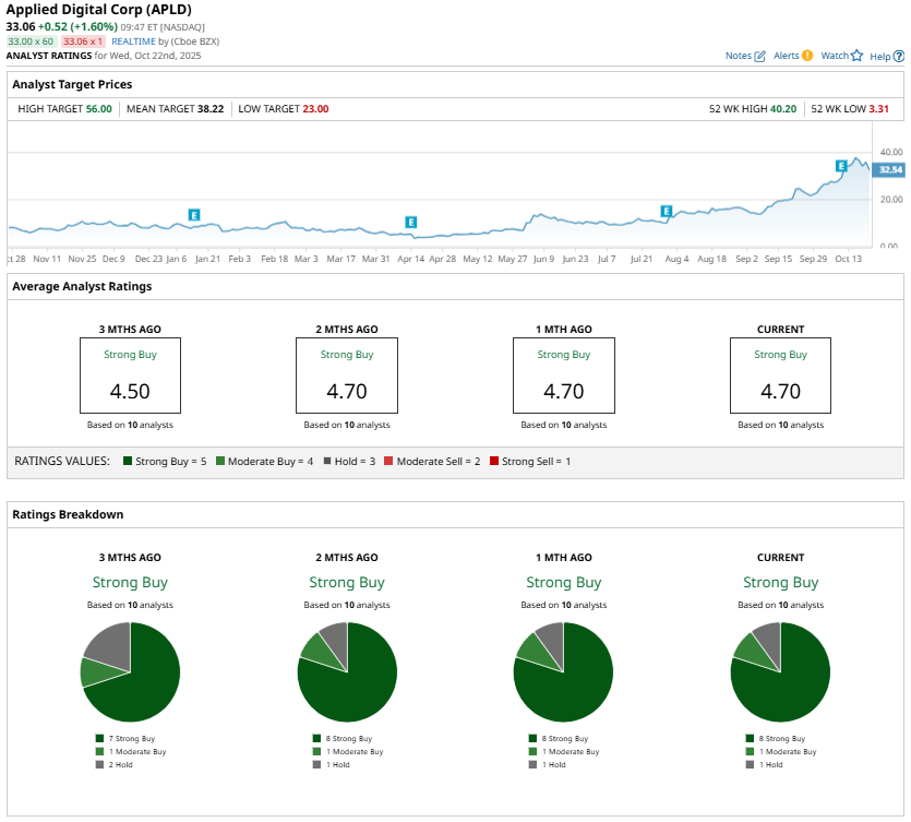 Wall Street analysts are bullish about Applied Digital’s prospects. The Street's highest price target is $56 for APLD, implying about 72% upside potential in one year from its closing price of $32.54 on Oct. 21. This target doesn’t seem out of reach. Applied Digital’s expanding scale, combined with the potential for a significant contract or partnership, could propel the stock past the $56 mark.