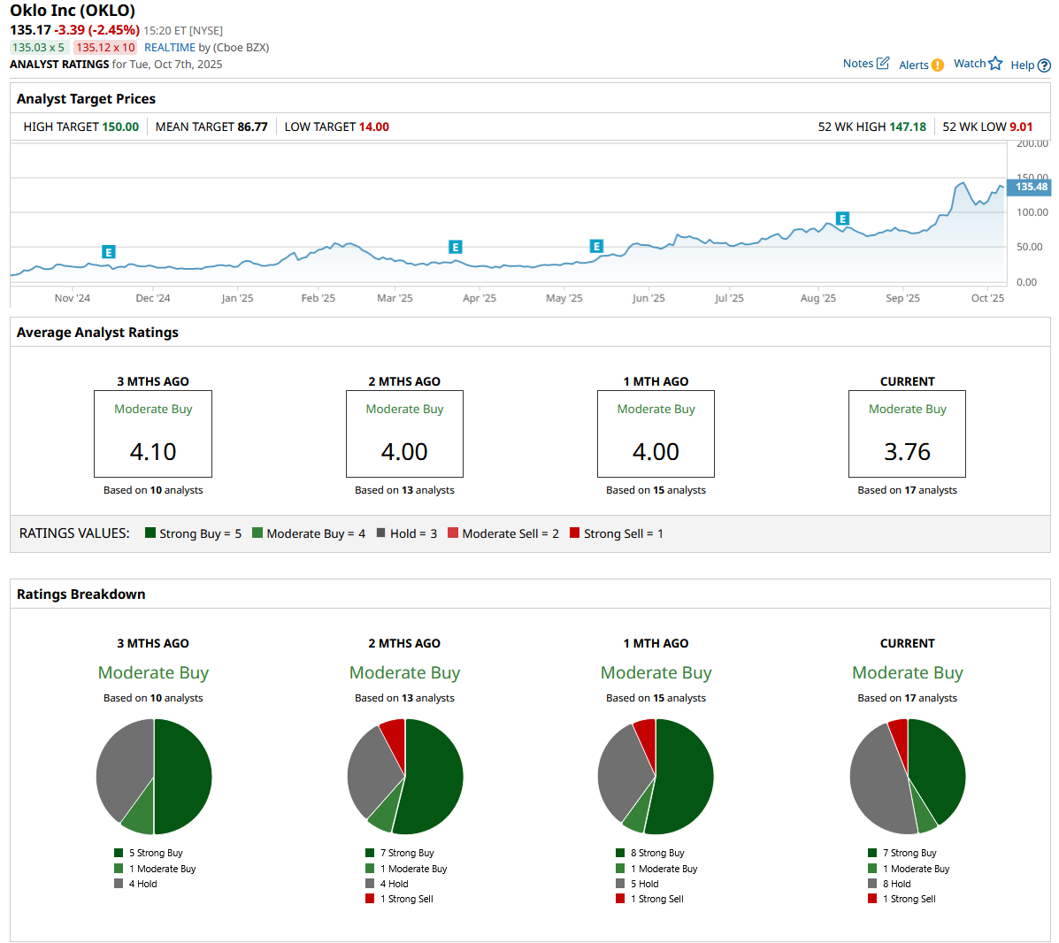OKLO stock has earned an overall “Moderate Buy” rating on Wall Street. Of the 17 analysts covering the stock, seven rate it a “Strong Buy,” one says it is a “Moderate Buy,” eight say it is a “Hold,” and one rates it a “Strong Sell.”