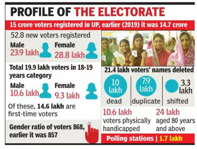 lakh are male, 9. 26 lakh are female voters,” the CEO said. According to census projections (2021) for Covid-19 vaccination drive, there are 1. 4 crore youngsters in UP in the age group of 15-17 years. Responding to a TOI query as to why the registration of first-time voters was low, the CEO said, “We tried to cover as much population as we could. ”