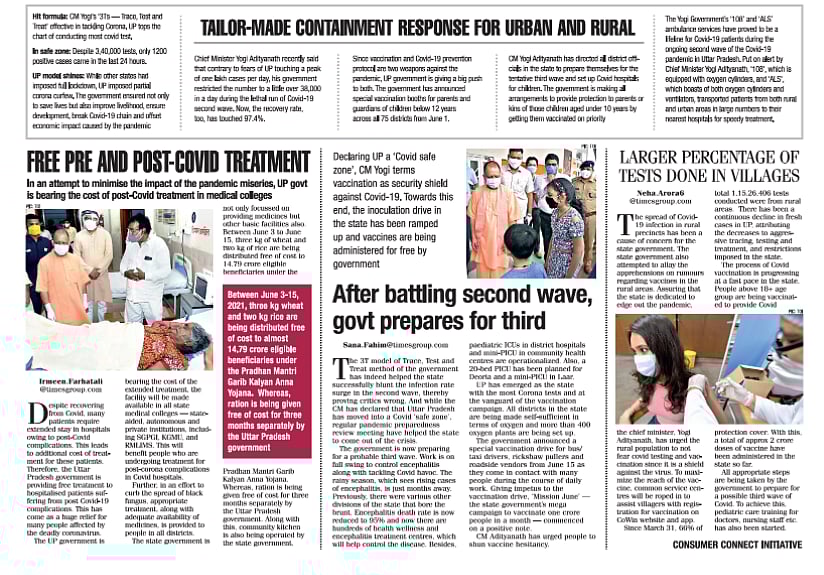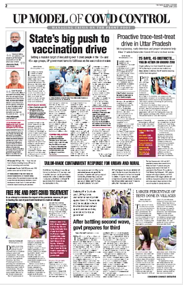 "A hit for Covid management", "big push vaccination drive", "free treatment": This is what Lucknow readers of the Times of India woke up to this morning. An entire page of the newspaper was dedicated to the "Uttar Pradesh model of Covid control", singing paeans to how the Adityanath government has handled the pandemic.