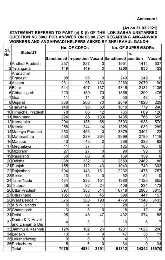 The states and UTs which have filled all the sanctioned posts of CDPOs in their states are MP (out of 453 posts), Andhra Pradesh (257), Telangana (149), Arunachal Pradesh (98), Goa (11), Manipur (43), Mizoram (27), Nagaland (60), Sikkim (13), Chandigarh (3) and Puducherry (5).