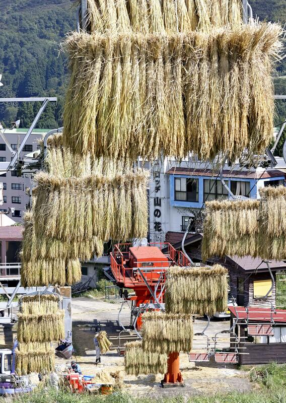 Sheaves of freshly harvested Minami-Uonuma Koshihikari rice are dried on a chairlift at the Ishiuchi Maruyama Ski Area in Minami-Uonuma, Niigata Prefecture. The lift operator came up with the idea in 2004 to make use of the machine during the off-season. The rice travels 400 meters, one way, for four to five days to sweeten in the sun. The Tenku-mai, or sky rice, sells for 10,800, yen tax included, per five kilograms.