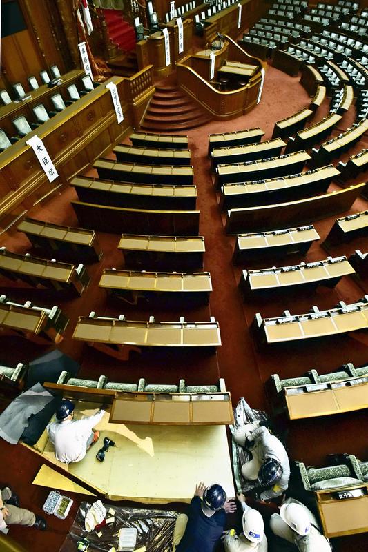 Renovation work in the main conference hall was conducted on Sunday. In order for the two lawmakers to be able attend Diet sessions in their large wheelchairs, the three rearmost seats near the entrance were removed to secure enough space. Electric power sources will be installed to facilitate the use of medical devices and laptops.
