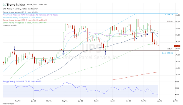 If UPS stock can clear the 21-month moving average, look for a test of the declining 10-week moving average. Above that opens the door to the key 50-week moving average, just above $200.