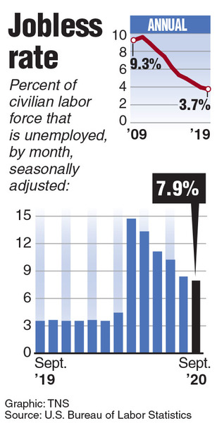 WASHINGTON _ U.S. job gains slowed in September and many Americans quit looking for work, suggesting the economic recovery is downshifting as the country struggles without a COVID-19 vaccine or fresh government aid.