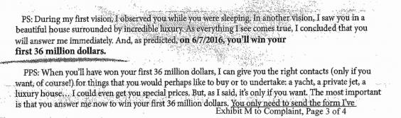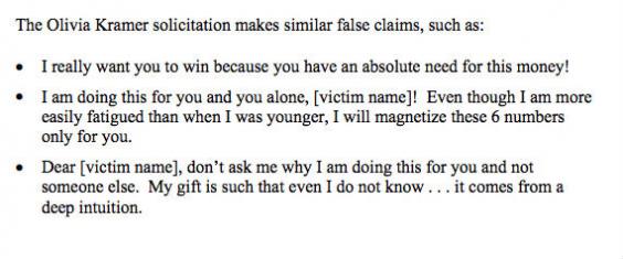 Other mails purported to be from a woman called Olivia Kramer with "psychic powers” who promises to improve the victim’s financial and personal circumstances, and predicts that person will win the lottery. The mail urges the victim to purchase supernatural objects or services to secure the sum.