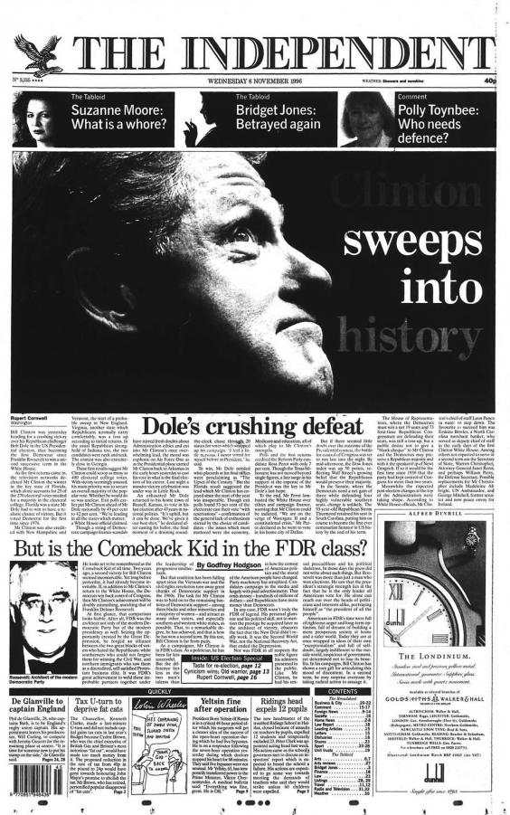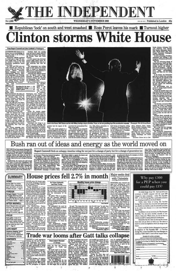 Bill Clinton wins his first term against Republican George Bush with only 43 per cent of the vote, as independent candidate Ross Perot secures nearly 19 per cent – the highest for any third-party candidate in a US presidential election in 80 years.