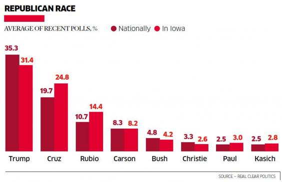 By most reckonings, it was Cruz who came out worst most damaged from the last debate on 28 January – the one Mr Trump skipped - not least for whining to moderators about the unrelenting challenges to him. It was Rubio that the Des Moines Register, the biggest Iowa paper, recently endorsed. On 30 January, The New York Times threw its weight among Republicans behind John Kasich, the Governor of Ohio.