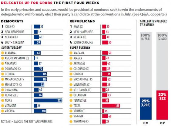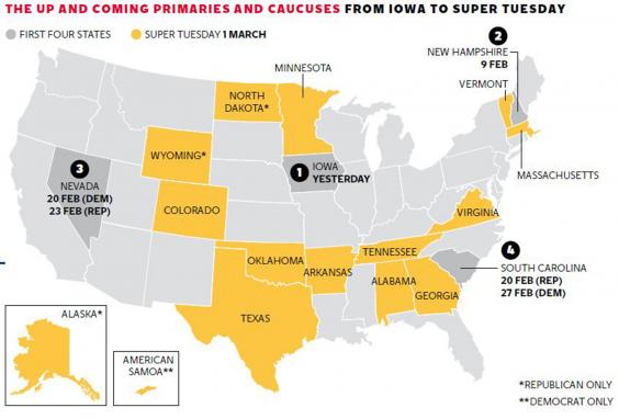 A | Super Tuesday, this year on 1 March, is the big one. There are 15 primary votes taking place, from Alabama to Wyoming, and this is often the day that makes or breaks a candidate. It should certainly thin out the Republican field. The last of the primaries is Washington DC’s on 14 June.