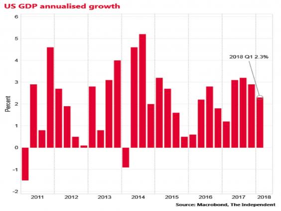 The Bureau of Economic Analysis (BEA) reported that the annualised rate of GDP growth was 2.3 per cent in the three months to March, down from 2.9 per cent in the final quarter of 2017.