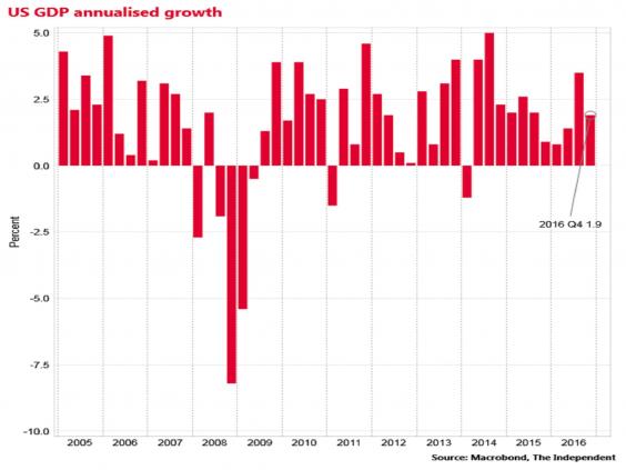 American GDP growth slowed to an annualised rate of 1.9 per cent in the final quarter of 2016.