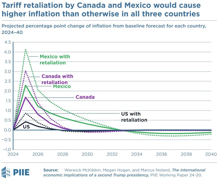 Some recent modelling on the impact of Trump’s proposed tariffs on Canada and Mexico supports this view. Tariff retaliation is likely to raise inflation rates even further than otherwise in all three economies.