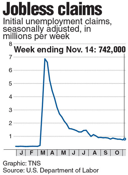 Continuing claims — the total pool of Americans on ongoing state unemployment benefits _fell 429,000 to 6.37 million in the week ended Nov. 7. The number of Americans claiming extended assistance continued to rise as many unemployed exhausted regular state benefits.