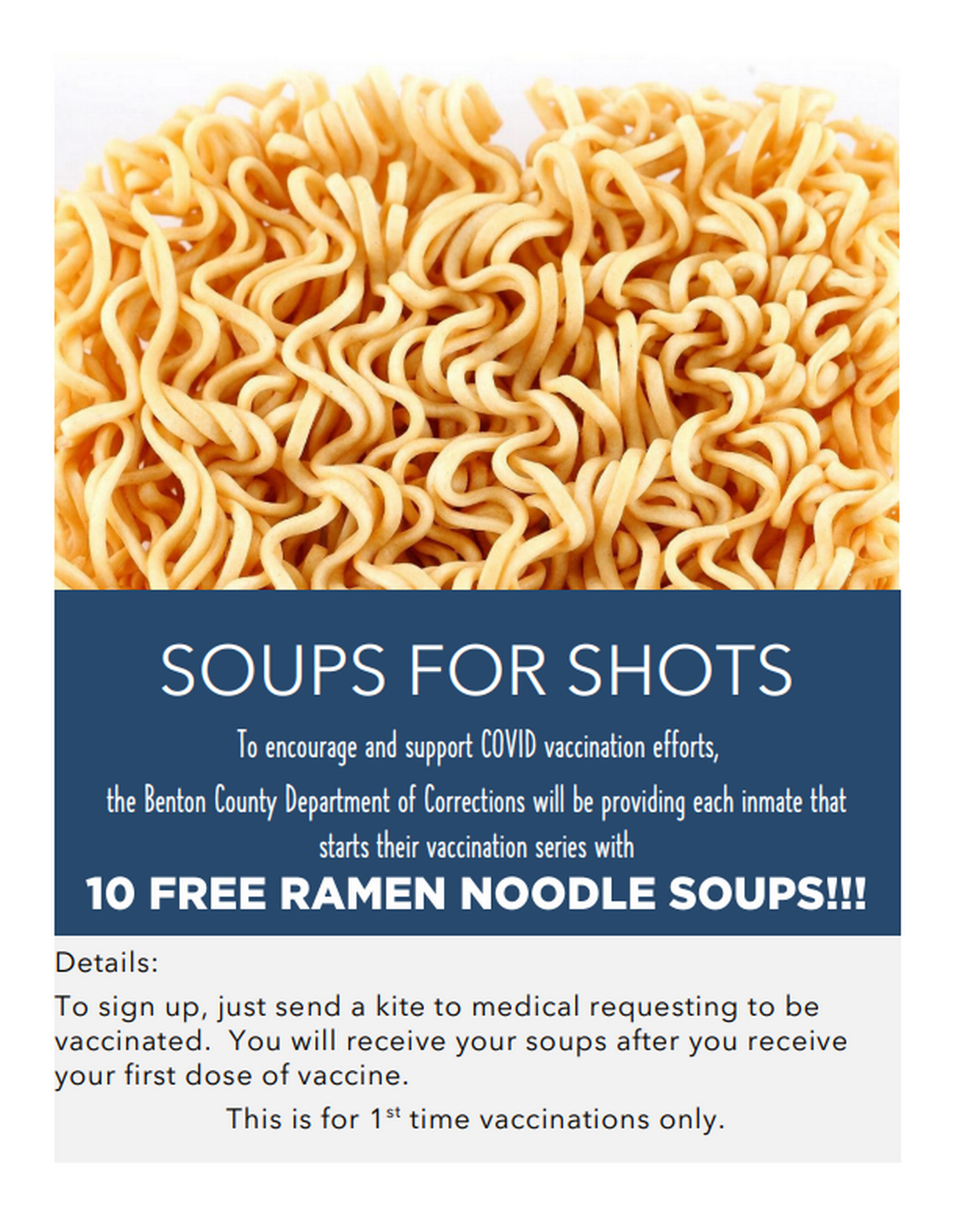 “To encourage and support COVID vaccination efforts, the Benton County Department of Corrections will be providing each inmate that starts their vaccination series with 10 FREE RAMEN NOODLE SOUPS!!!” the posters read.