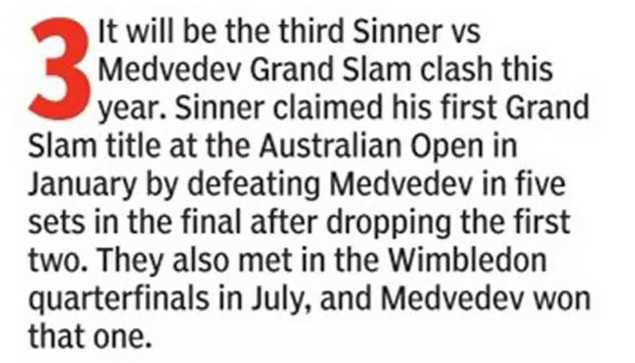 Medvedev, who has struggled with his shoulder early in the season, which resulted in a slower serve, has improved with every outing in New York. Sinner, who has looked set from the word go, scored a straight set 7-6, 7-6, 6-1 win over American Tommy Paul to make the last-eight stage.