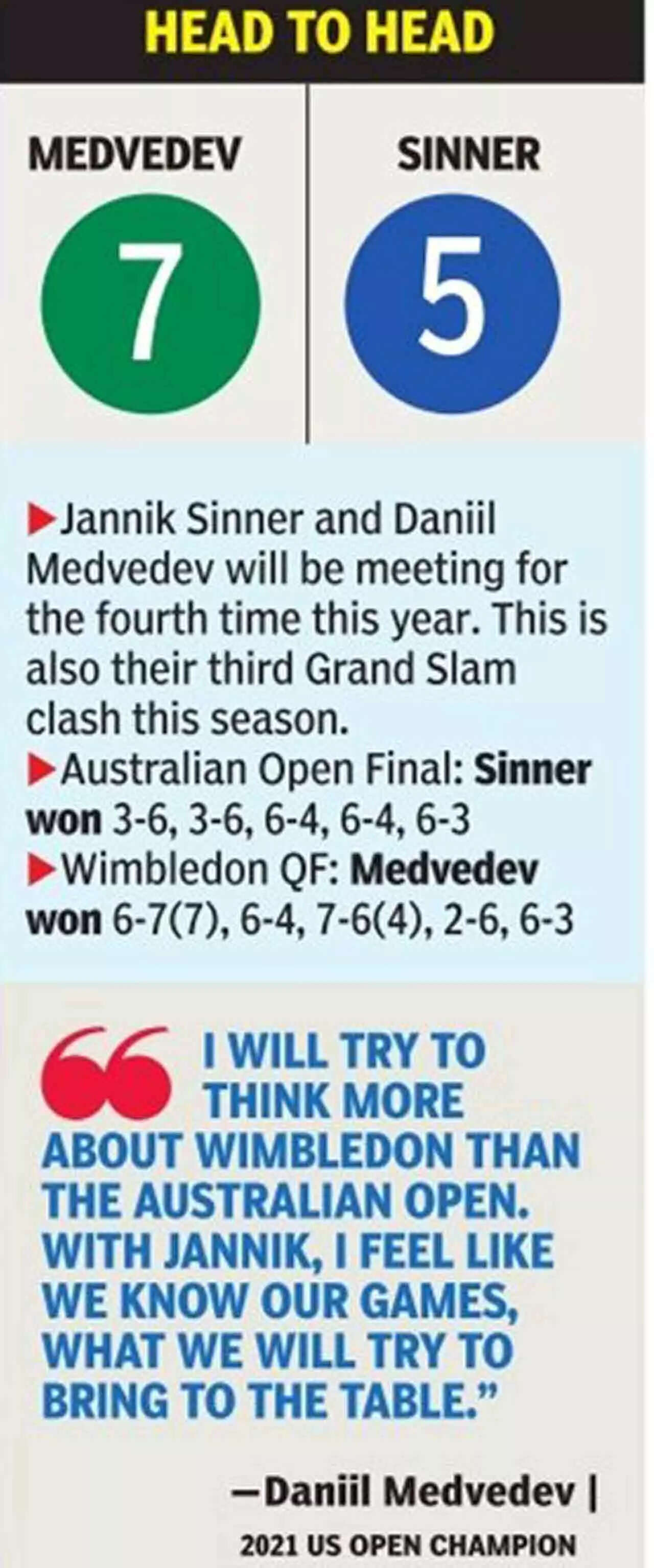 Sinner, who has lost just five matches this year, has reached at least the quarterfinals at all four majors this season, becoming just the eighth men's singles player since 2000 to accomplish the feat. "I will try to think more about Wimbledon than the Australian Open," Medvedev said, smiling. "Against Jannik, we had some tough matches, we know each other's game, maybe I will try and surprise him."