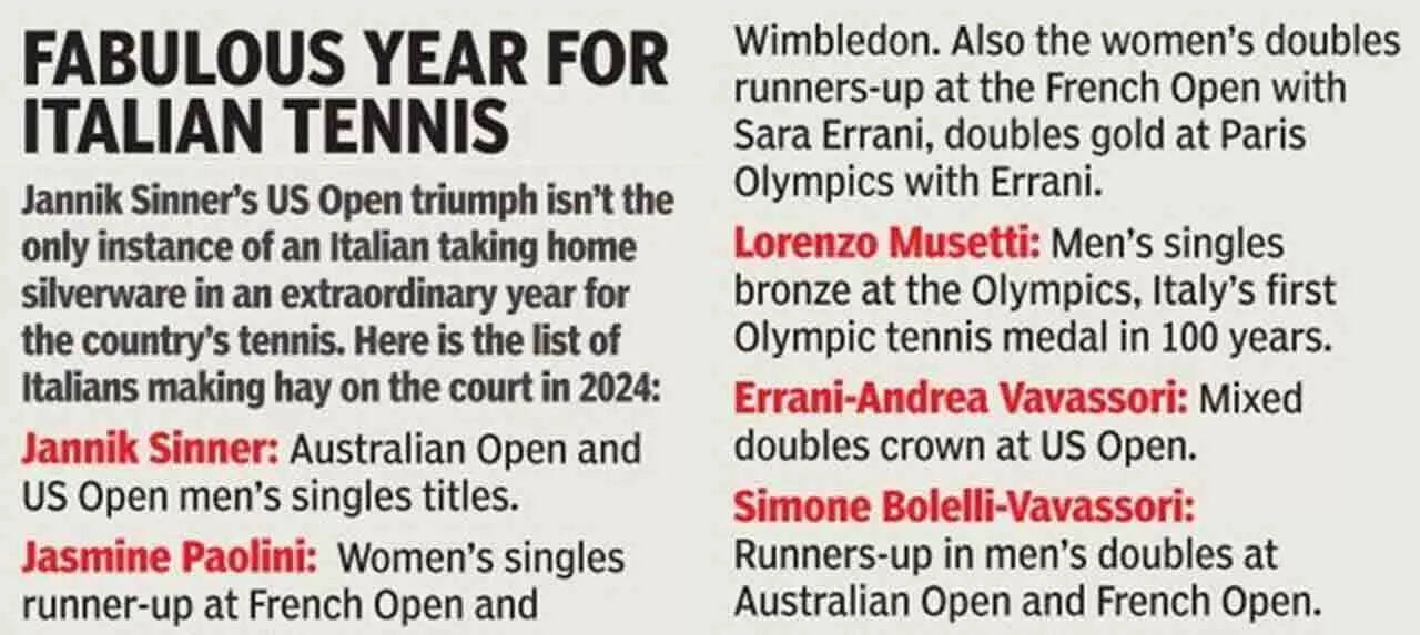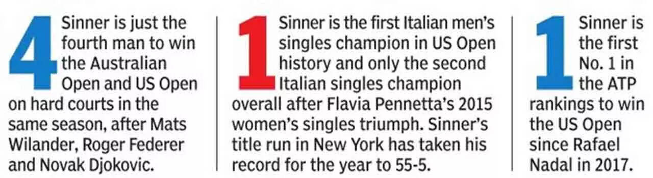 So, when Sinner threw up his arms up at the end of a power-packed slugfest with American Taylor Fritz, where he had rallied from 3-5 in the third set, reeling off four straight games to seal a dominant win, he stood tall in the winner's circle that isn't for the weak hearted. The world No. 1 took down Fritz, the top-ranked American, 6-3, 6-4, 7-5 to claim his second Grand Slam title of the year, making him the first Italian man to win in New York and also the first man in 47 years to claim his first two Grand Slam titles in the same season.