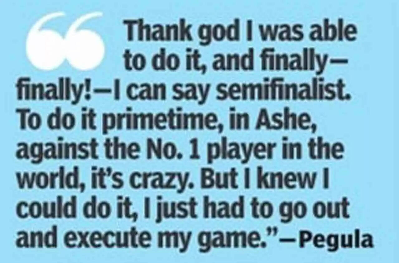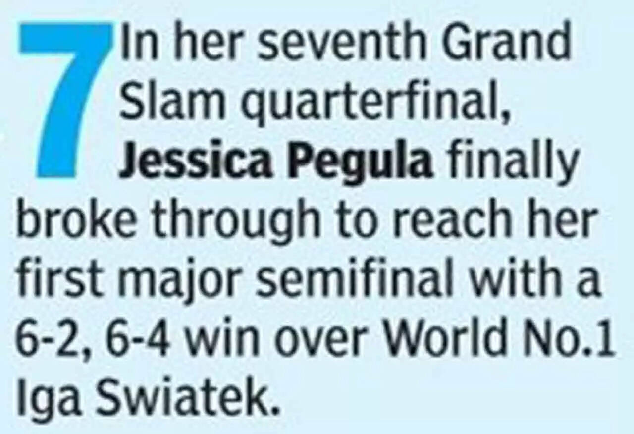 Pegula, the world No.6, came through 6-2, 6-4 to make her first major semifinals, after going 0-6 in Grand Slam quarterfinals. Pegula, the form player, who won the title in the Canadian Open and finished runner-up in Cincinnati, plays gifted Czech Karolina Muchova for a place in the final, while another American Emma Navarro takes on the second seed Aryna Sabalenka in the other last-four clash.