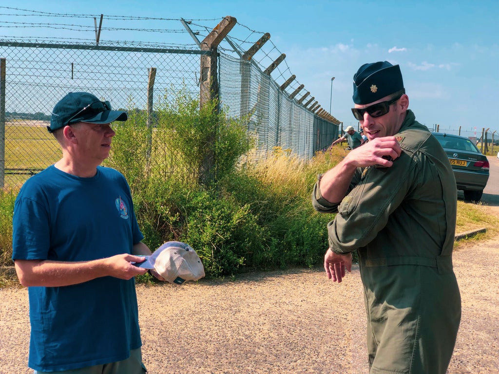 U.S. Air Force Maj. Grant Thompson thanked a British photographer the best way he knew how - by ripping the flight patch from his shoulder and handing it to the man whose quick action last week ensured he landed safely after an engine in his F-15E Strike Eagle malfunctioned.